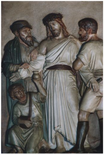 Der Herr ist am Ziel. Zu Tode erschöpft erreicht Jesus den Kalvarienberg. Er muß zusehen, wie seine grausame Hinrichtung vorbereitet wird. Die Soldaten treten heran und reißen ihm die Kleider vom Leib. Die Wunden der Geißelung beginnen erneut zu bluten. Schweigend erduldet der Herr all dies.
