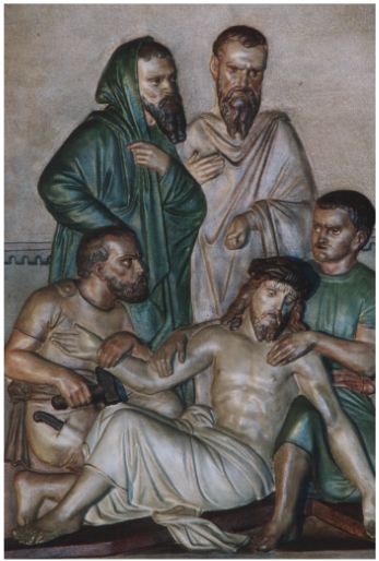 Was da geschieht, ist schrecklich. Man möchte fliehen, um es nicht mit ansehen zu müssen. Die Soldaten werfen Jesus zu Boden. Sie durchbohren seine Hände und Füße und schlagen ihn ans Kreuz. Den Weg hat Jesus noch gehen können. Nun kann er nichts anderes mehr als aushalten.